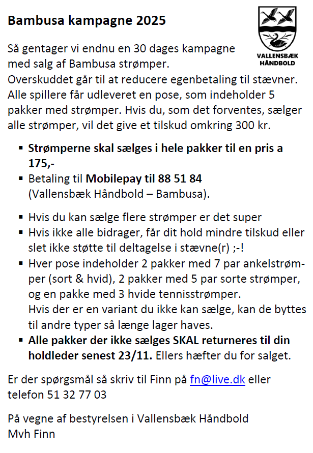 Fra torsdag 23/10 til 23/11 kører vi kampagne med salg af strømper fra Bambusa. Overskuddet vil blive brugt på vores ungdomsspillere, og det forventes at alle Vallensbæk spillere fra U11 til U19 sælger minimum 5 pakker strømper, som hver koster 175kr.